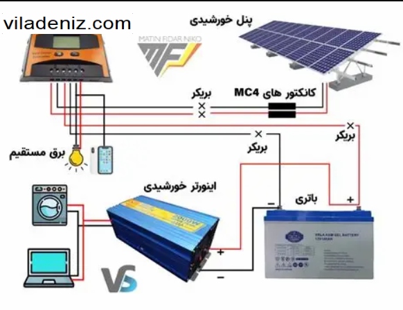 اینورتر: تبدیل جریان مستقیم (DC) ذخیره شده در باتری به جریان متناوب (AC) برای مصارف خانگی.
