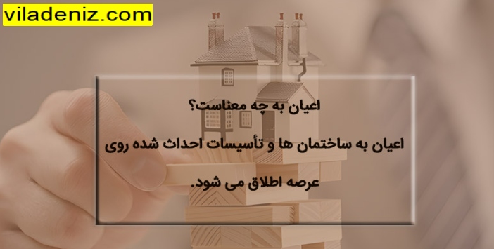 اعیان به هر گونه بنا و ساختمانی اطلاق می شود که به صورت دائم بر روی زمین احداث شده است. این شامل ساختمان اصلی ویلا، دیوار کشی ها، استخر، و سازه های ثابت دیگر است. در اسناد ملکی، اعیان مشخص کننده ارزش بنای احداث شده و معمولاً در کنار عرصه ذکر می شود. تفکیک دقیق اعیان از عرصه در محاسبات مالیاتی، عوارض شهرداری و هنگام انتقال سند اهمیت حیاتی دارد.